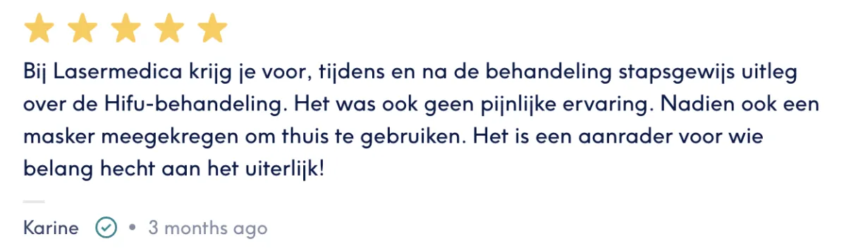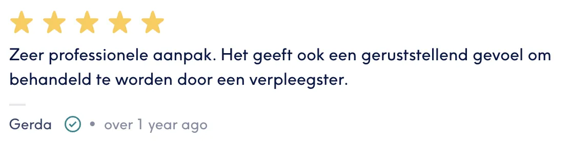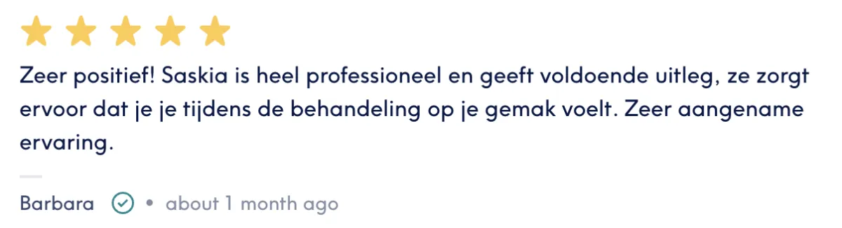 "Professionele aanpak! Na de eerste behandeling had ik al een geweldig resultaat. Alles perfect verlopen. Zeker een aanrader!!"